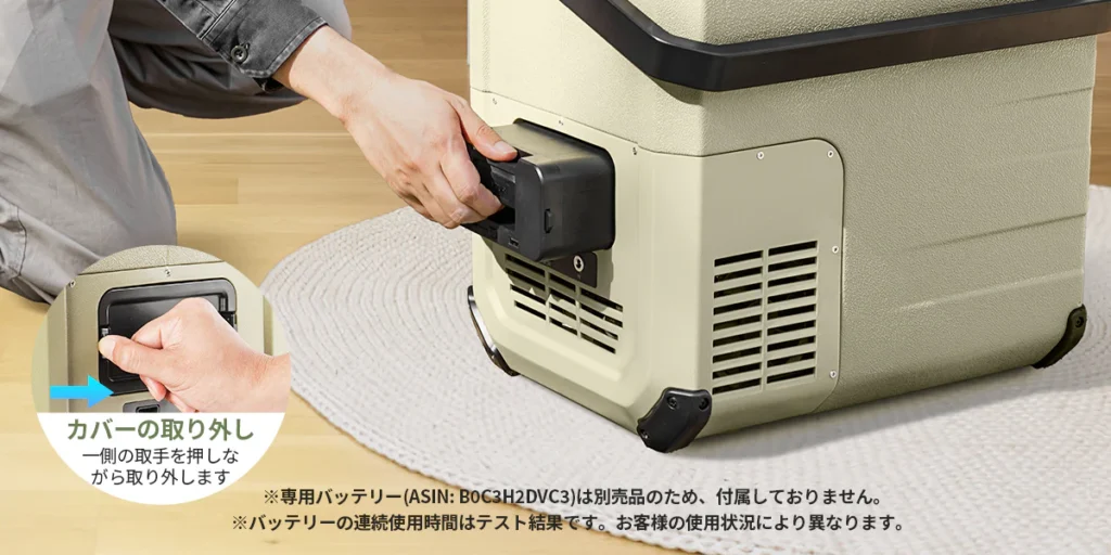 • 車外への持ち運び: テントサイトへの移動やデイキャンプでの利用時、電源コードを気にせず冷蔵庫単体で持ち運べる(使い勝手が向上)。