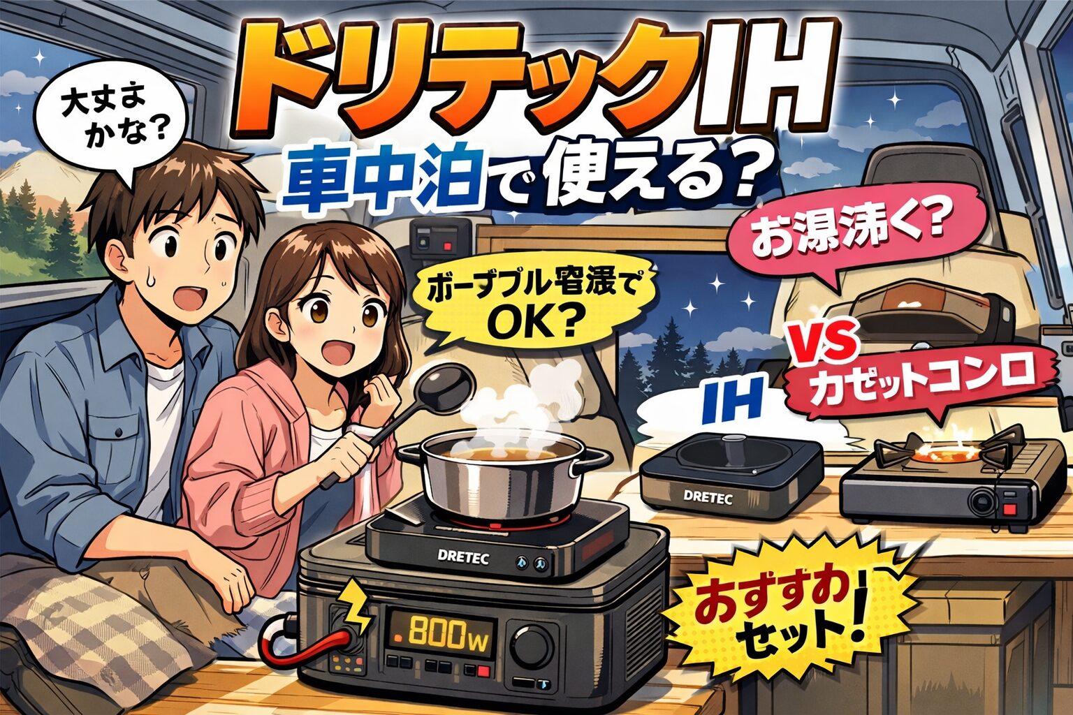 この記事では、ドリテックのIHを車中泊で使う際の実際の消費電力や、ポータブル電源との相性、そして車内での取り回しの良さを具体的にレビューします。読み終える頃には、あなたの車内調理がどれほど快適に、そして安全にアップグレードされるかが明確にイメージできているはずです。