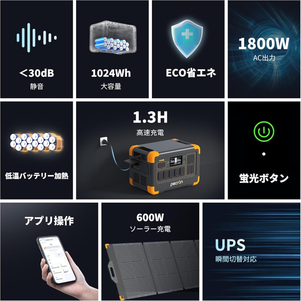 その最大の理由は、「1024Whの容量」と「1800Wの高出力」という、家庭用家電のほぼすべてを動かせるスペックを持ちながら、他社を圧倒するコストパフォーマンスを実現している点にあります。1000Whクラスは競合が最も多い激戦区ですが、Pecronは最新のリン酸鉄リチウムイオン電池(LFP)を採用しつつ、驚きの価格設定で市場の注目を独占しています。